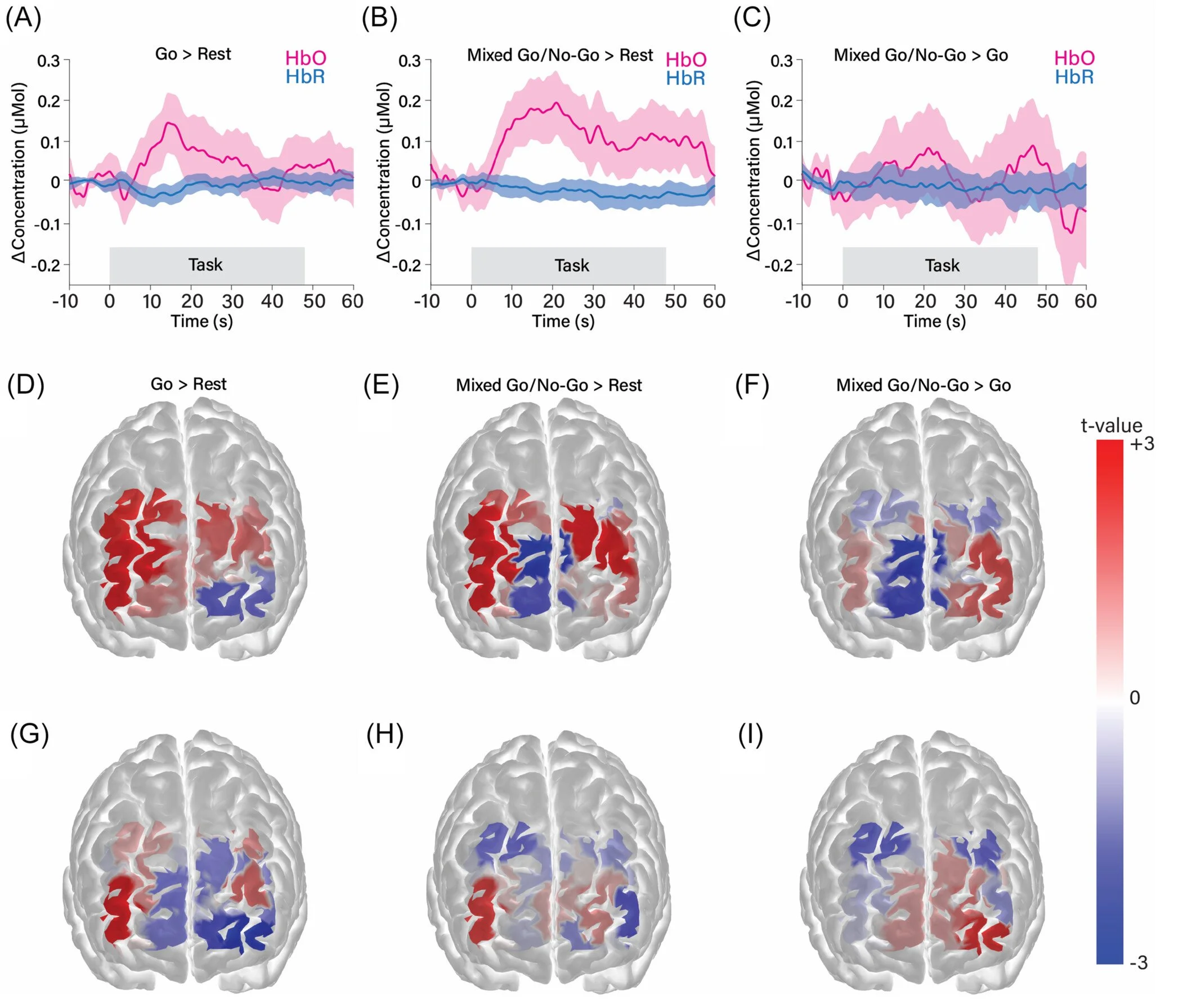What happened in the brain during the Go/No-Go task? Panels A–C show how blood flow in the prefrontal cortex changed during different parts of the task. When the brain works harder, it draws more oxygenated blood to the active region — a signal captured by fNIRS as a rise in oxyhemoglobin (HbO, the oxygen-carrying form of hemoglobin) and a corresponding dip in deoxyhemoglobin (HbR, the oxygen-depleted form). These curves, plotted over time, are called hemodynamic responses and serve as a proxy for neural activity. Panel A shows the brain's response during the simple Go blocks compared to rest — reflecting the baseline demands of paying attention and pressing a button. Panel B shows the response during the mixed Go/No-Go blocks compared to rest, which captures the combined demands of attention and impulse control. Panel C is the most informative comparison: the Go/No-Go blocks directly contrasted against the Go-only blocks. By subtracting out the shared demands of basic attention, this comparison isolates the brain activity specifically required to suppress a response — the cognitive act of holding back — which is the core executive function tested by this task. Panels D–I translate these signals into maps of the prefrontal cortex, showing which specific regions were most active during each comparison. The maps are shown separately for HbO (panels D–F, where warmer colors indicate greater oxygenation) and HbR (panels G–I, where the expected pattern is a mirror image — a decrease in the same regions). Together, these two signals provide converging evidence for where in the prefrontal cortex the brain is doing the extra work of inhibitory control — and lay the foundation for comparing that activation between children with and without sleep-disordered breathing.